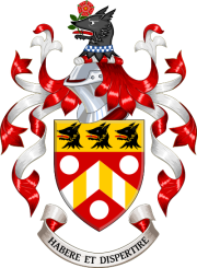 Crest: A wolf's head erased sable gorged with a collar vair, holding in the mouth a rose slipped proper.