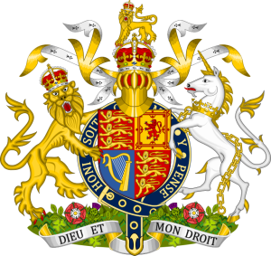 Shield: Quarterly, 1 & 4, Gules three lions passant guardant in pale or (England), 2, Or a lion rampant within a double tressure flory counter-flory gules (Scotland), 3, Azure a harp or stringed argent.