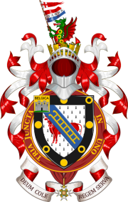 Crest: out of a naval crown Or a demi-dragon rampant Vert and Gules, charged on the body with three annulets Or, and holding a staff, hanging from which is a flag barry of three Gules, Argent and Azure, the Argent charged with the word BANDA in Sable; above the flag at the peak a pennon of St. George.