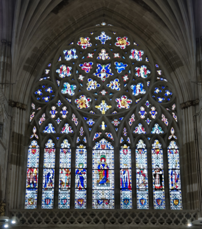 The present Great West Window of Exeter Cathedral was given its current glazing in 1950, after the previous window had been destroyed by enemy bombing in May 1942.