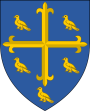 '''''Blazon''''': Azure, a cross flory between five martlets Or. | '''''Blazon''''': Azure, a cross flory between five martlets Or. | ||