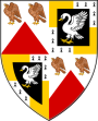 <p><small>'''''Blazon''''': Quarterly 1st & 4th, Per chevron argent and gules, in chief two falcons rising proper, belled or (''Stevens''); 2nd and 3rd, Sable, a swan argent membered or within a bordure quarterly or and ermine (''Moore'').<br/>