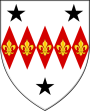 <p><small>'''''Blazon''''': Argent, five fusils gules, each charged with a fleur-de-lys or, conjoined in fess between three mullets sable, two and one.</p>